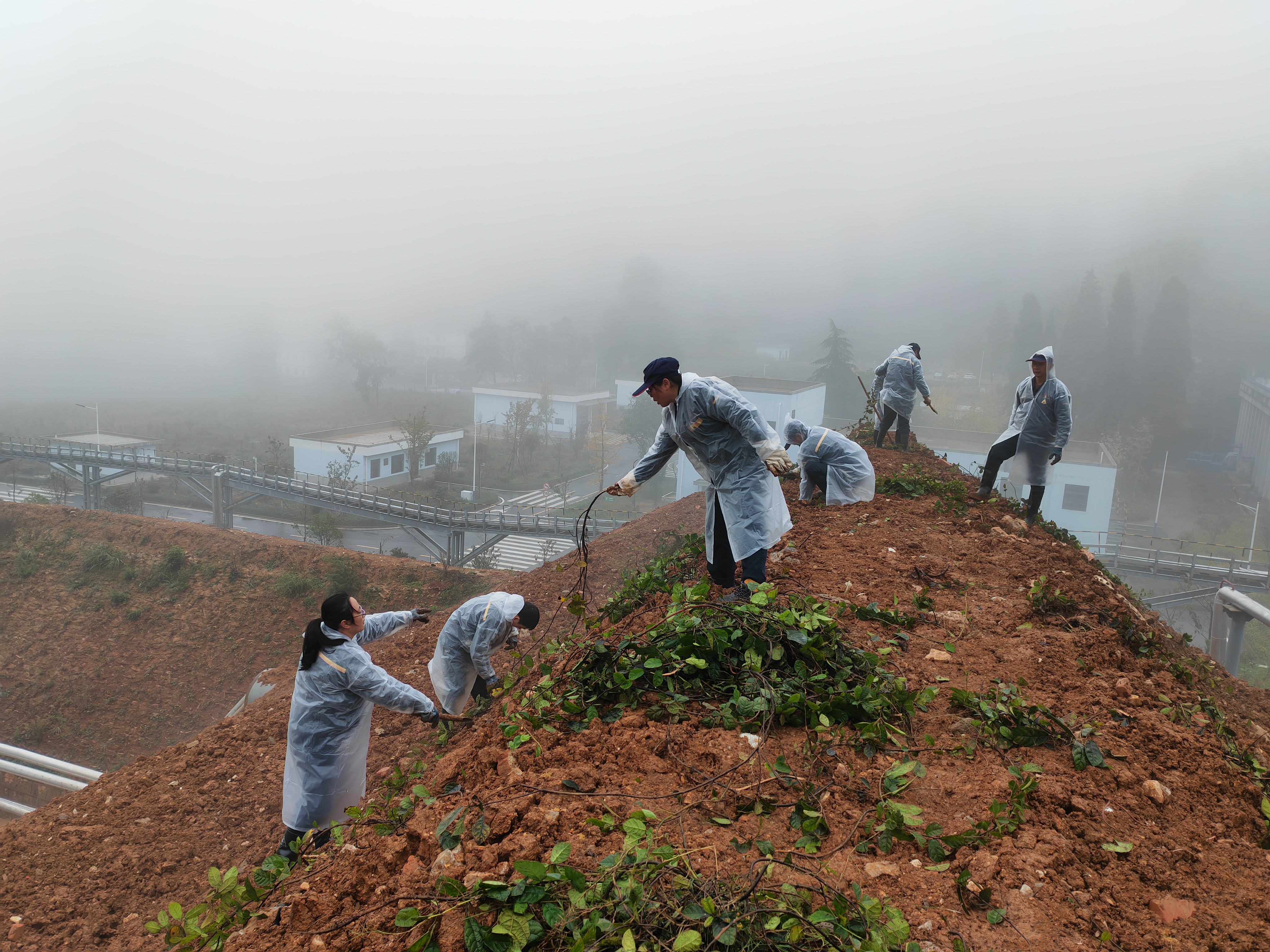 活動(dòng)當(dāng)天是二十四節(jié)氣中的“霜降”,大凹塘氣溫再降,陰雨綿綿,黨員同志們積極響應(yīng)黨支部號召,如約而至。經(jīng)過簡單分工,有的黨員負(fù)責(zé)到老生產(chǎn)線挖地石榴藤,并搬運(yùn)藤到新生產(chǎn)線,有的手持鐮刀挖坑栽種,大家分工協(xié)作、現(xiàn)場一片熱火朝天的景象?;顒?dòng)中大家的鞋子和褲腿沾滿泥土,臉上分不清是雨水還是汗珠,但依然擋不住大家對植綠護(hù)堤的熱情,各個(gè)精神飽滿、干勁十足,充分發(fā)揮黨員的模范帶頭作用。經(jīng)過同志們一個(gè)上午的共同努力,光禿禿的土堤上點(diǎn)綴上了點(diǎn)點(diǎn)綠色。